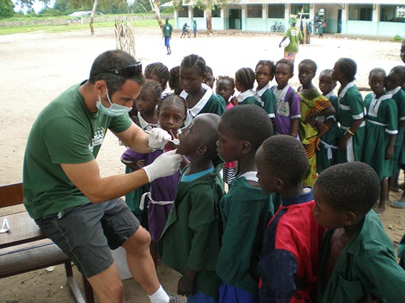 - la primera sobre el terreno, visitando, colegios, barrios y aldeas, haciendo un trabajo de sensibilización de la importancia de la higiene bucal apoyado con charlas, entrega de cepillos y pasta dental, una revisión completa, y aplicación de fluor como agente fortificante de la superficie dental ,siendo la primera barrera de elección como terapia preventiva de la caries. Para ello el equipo del proyecto permanece durante 15 dias recorriendo distintas zonas de trabajo como: Lamin, Basori, Bijilo, kukunjang, Talindin…. Los niños revisados se comprenden entre los 6 y 12 años que es cuando se desarrolla el denominado recambio dental.